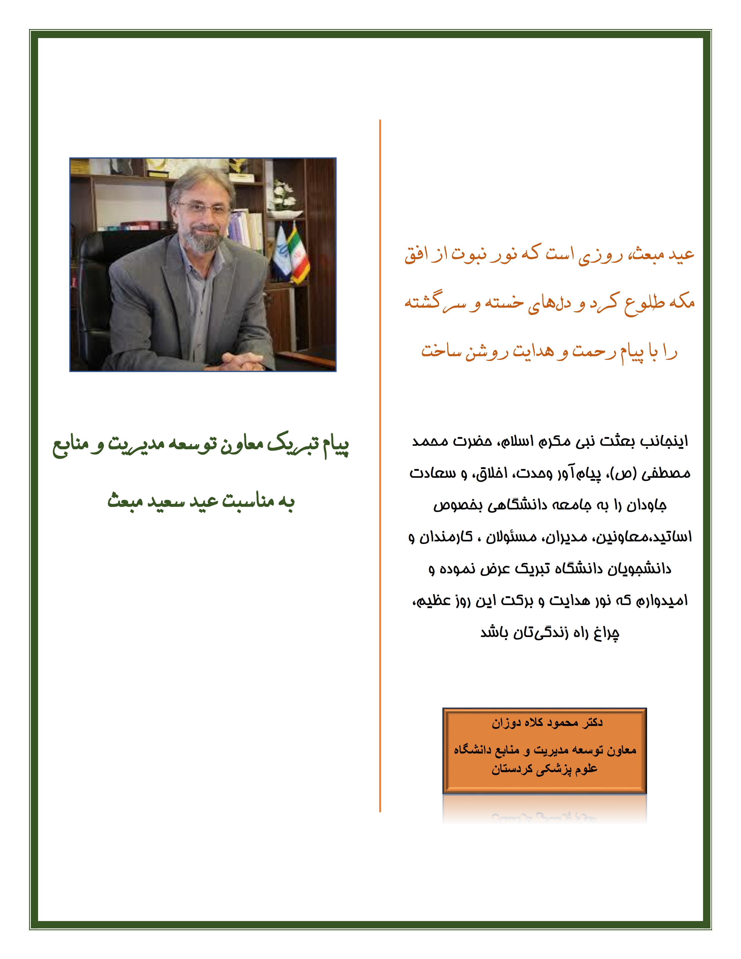 پیام تبریک معاون توسعه مدیریت و منابع به مناسبت عید سعید مبعث