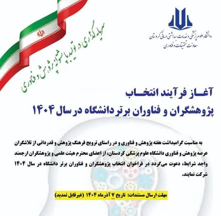 معاونت تحقیقات و فناوری دانشگاه علوم پزشکی کردستان با صدور اطلاعیهای رسمی، از اعضای هیئت علمی، پژوهشگران و کارکنان پژوهشگر واجد شرایط واحدهای تابعه دانشگاه دعوت کرد در فرایند انتخاب «پژوهشگران برتر سال ۱۴۰۴» شرکت کنند.